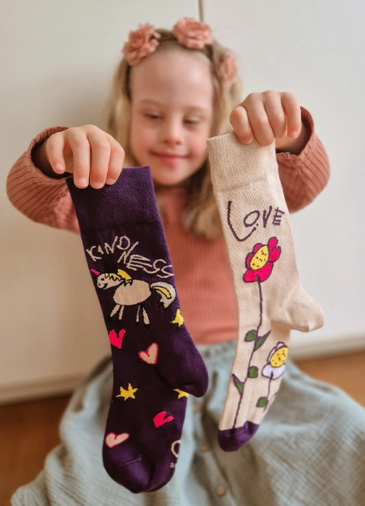 Die neue limitierte Auflage ist das Ergebnis einer wunderbare Zusammenarbeit zwischen Mutter und Tochter. Die Socken wurden mit viel Liebe entworfen, um Menschen mit Down-Syndrom dabei zu unterstützen, in der Gesellschaft sichtbarer zu werden.